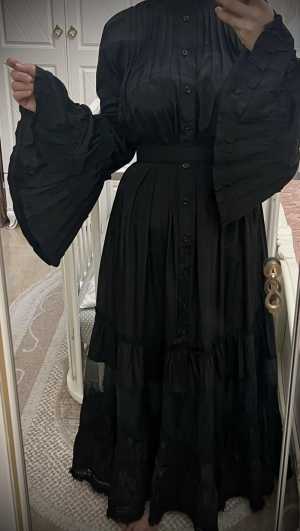 У платья ткань черная с черной сверкающей ниткой, есть оборка цельная от начала одного рукава поднимает к груди и...
